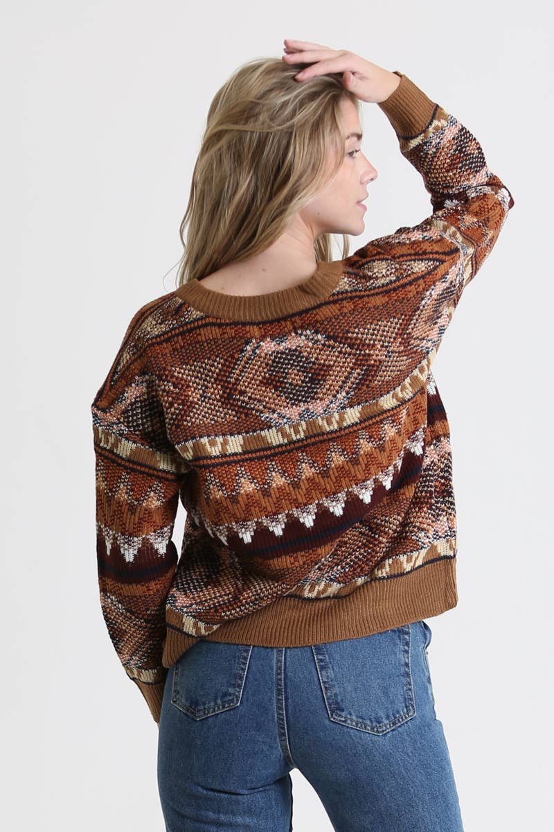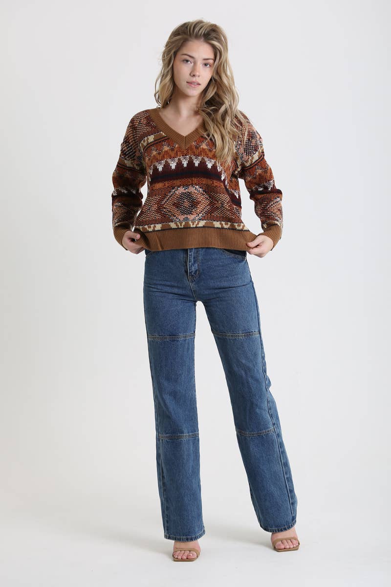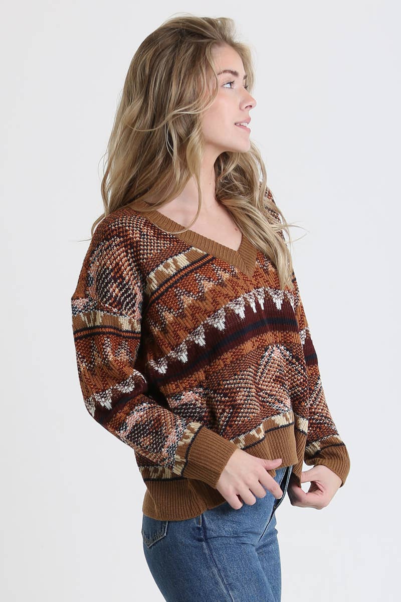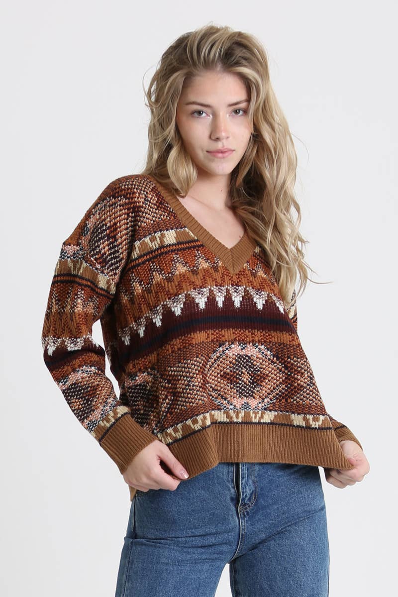 This v-neck pullover sweater in a warm mix of brown tones and has a unique southwest design that's bold and poetic.