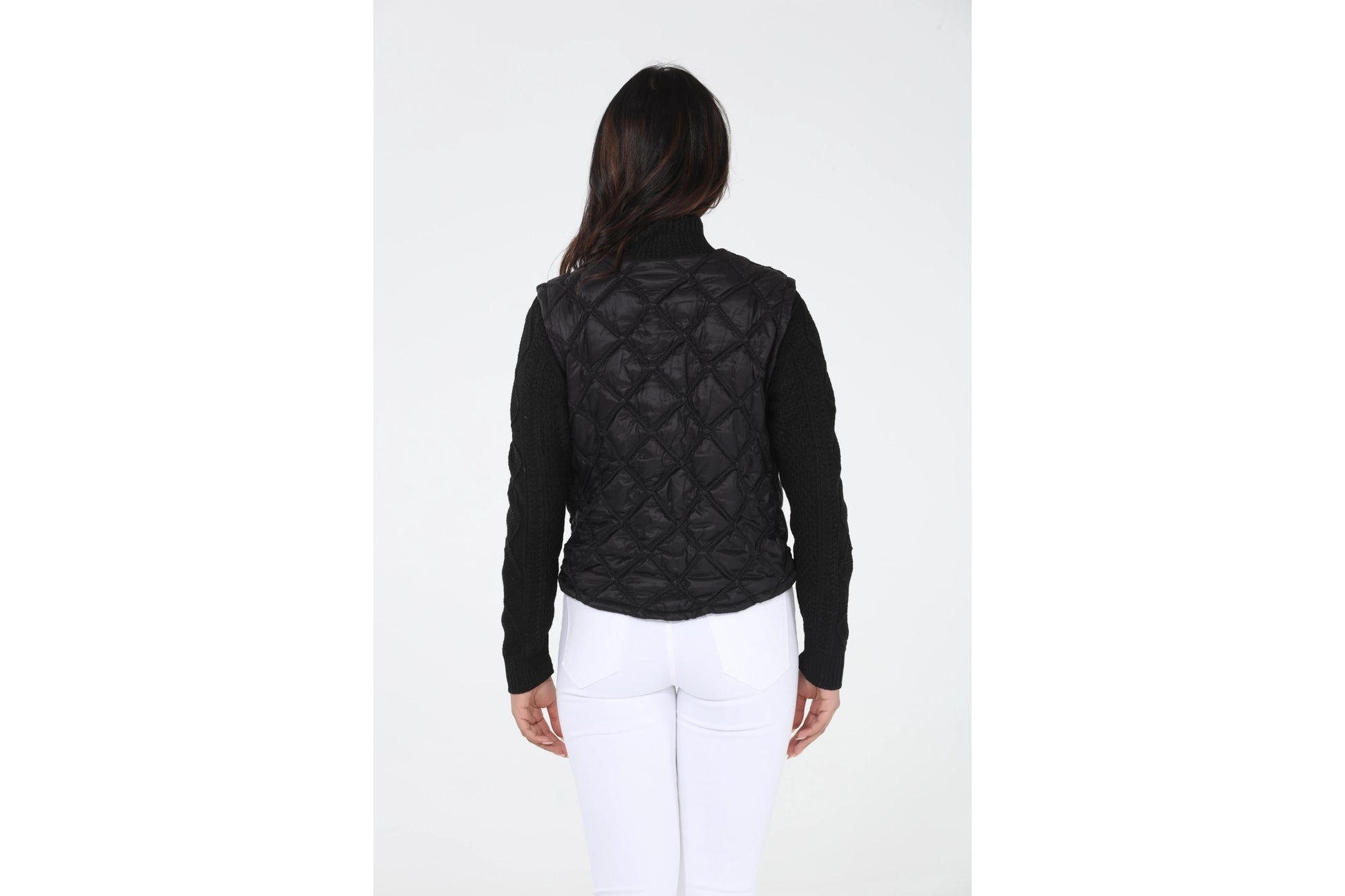 This unique jacket features a mix of faux leather and knit sleeves with a fun pattern design, along with a long neck zip-up for extra warmth