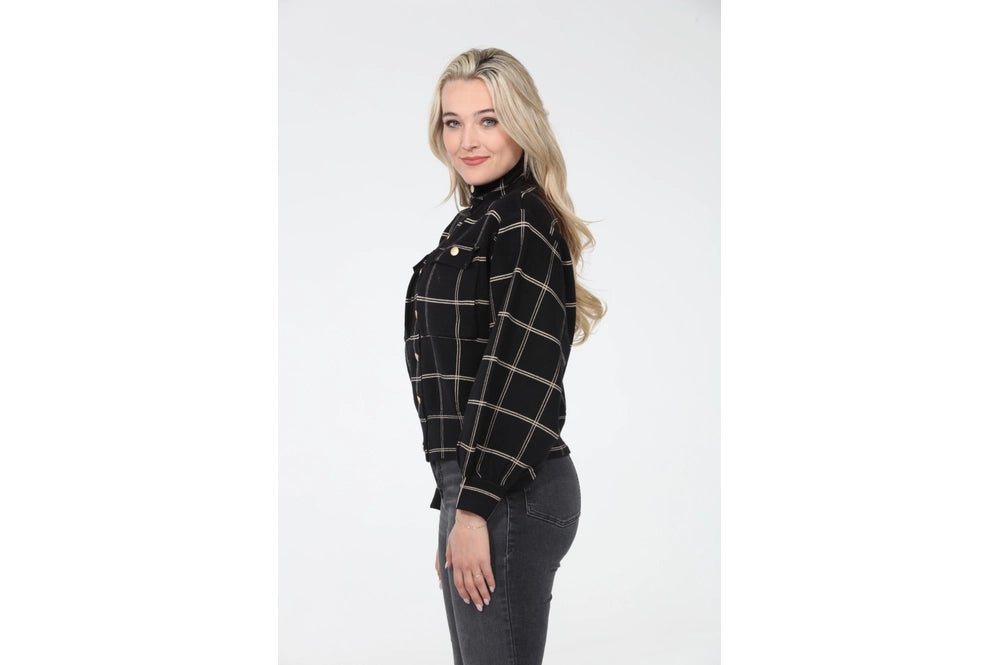 This warm sweater/jacket features a checkered pattern and a high neckline with a gold button-up closure, perfect for staying stylish and cozy.