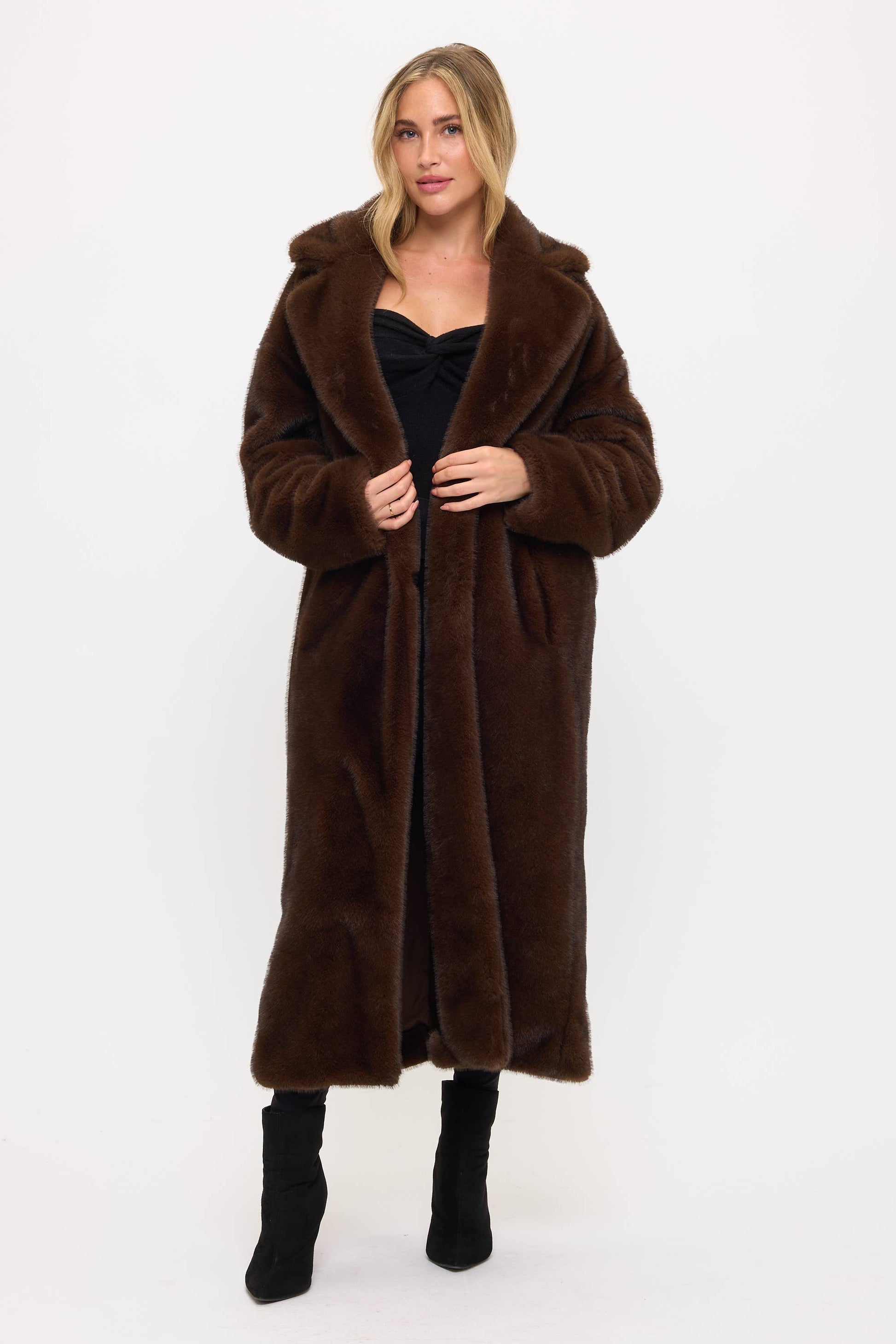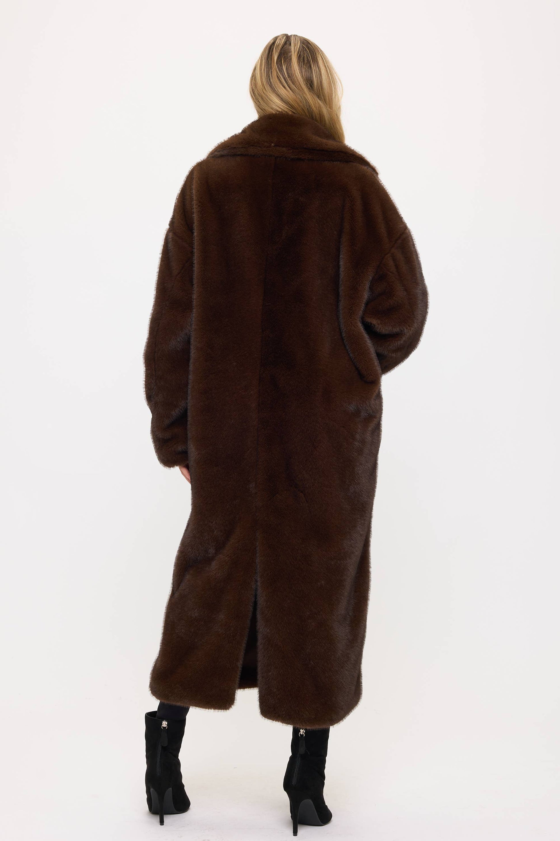 This commanding floor-length coat showcases plush faux fur construction with dramatic oversized silhouette for unparalleled winter luxury. The enveloping design creates sophisticated presence while delivering exceptional comfort through premium synthetic fur that feels cloud-soft against skin.