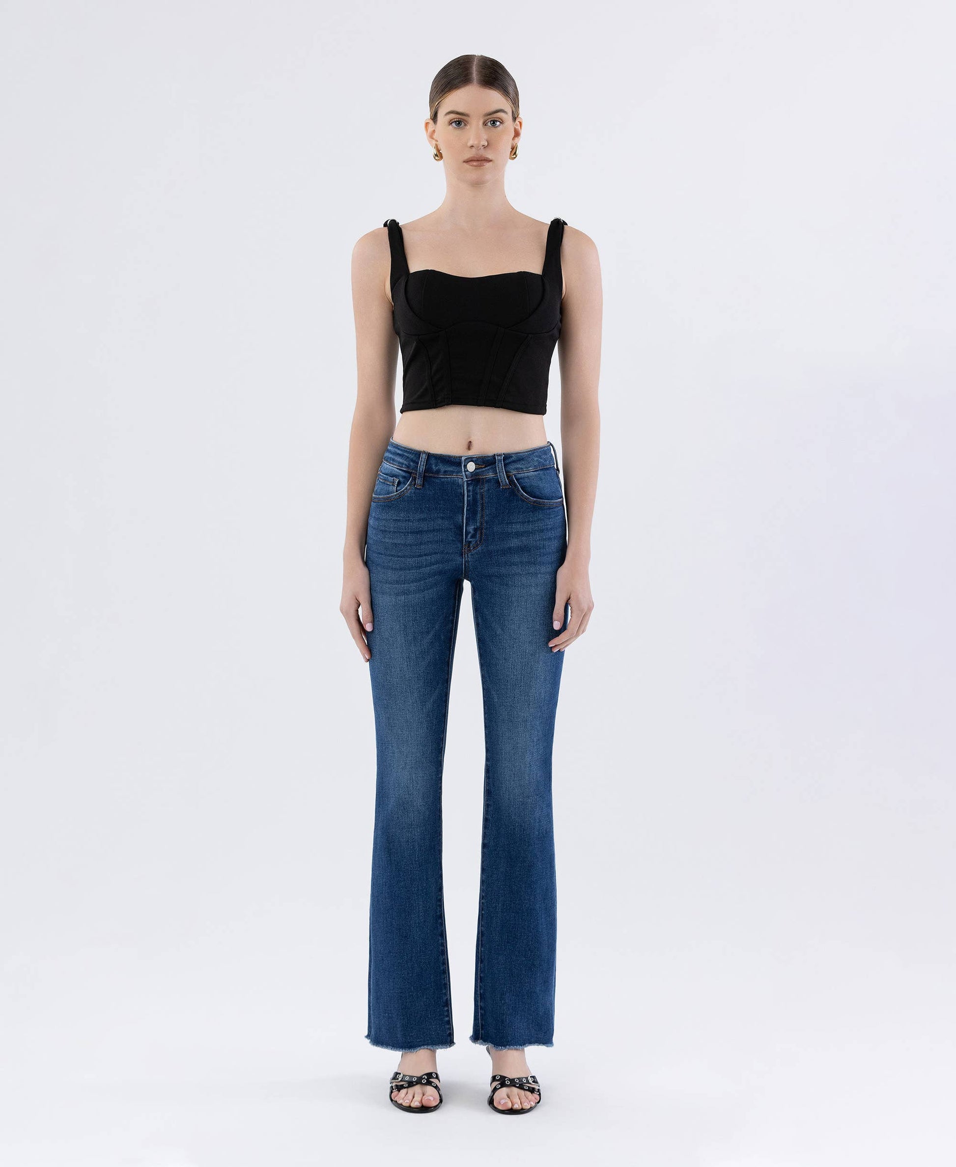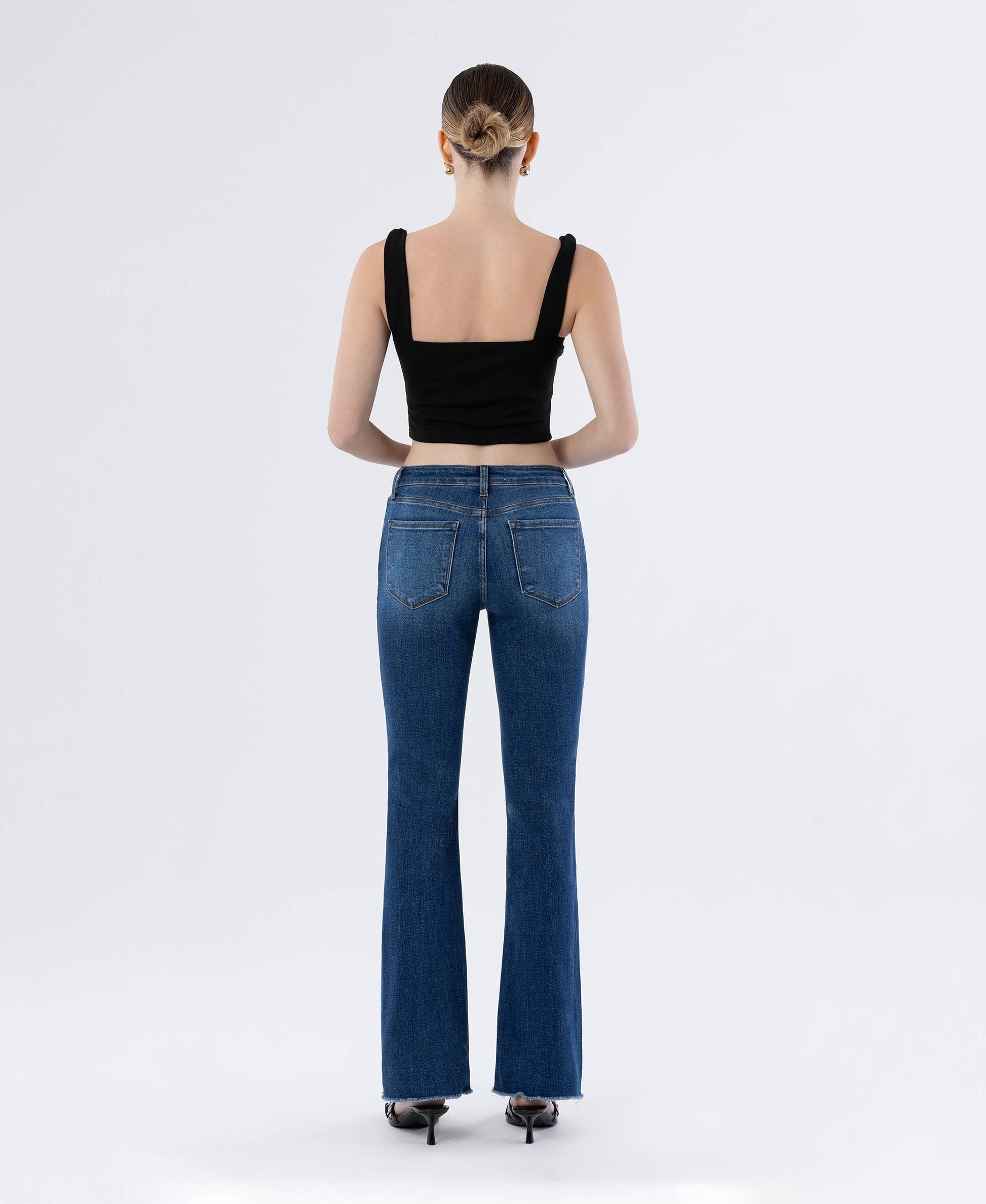 SOFT COMFORT STRETCH DENIM, WITH A MID RISE WAIST, 5 POCKETS, RAW HEM, DARK WASH, FULL LENGTH BOOTCUT JEANS