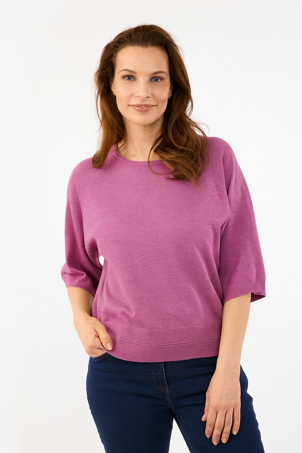 The knit is designed with a round neckline and short, loose-fitting sleeves, which create a casual and feminine look. The soft and fine knit fabric feels comfortable against the skin and drapes beautifully without feeling heavy.