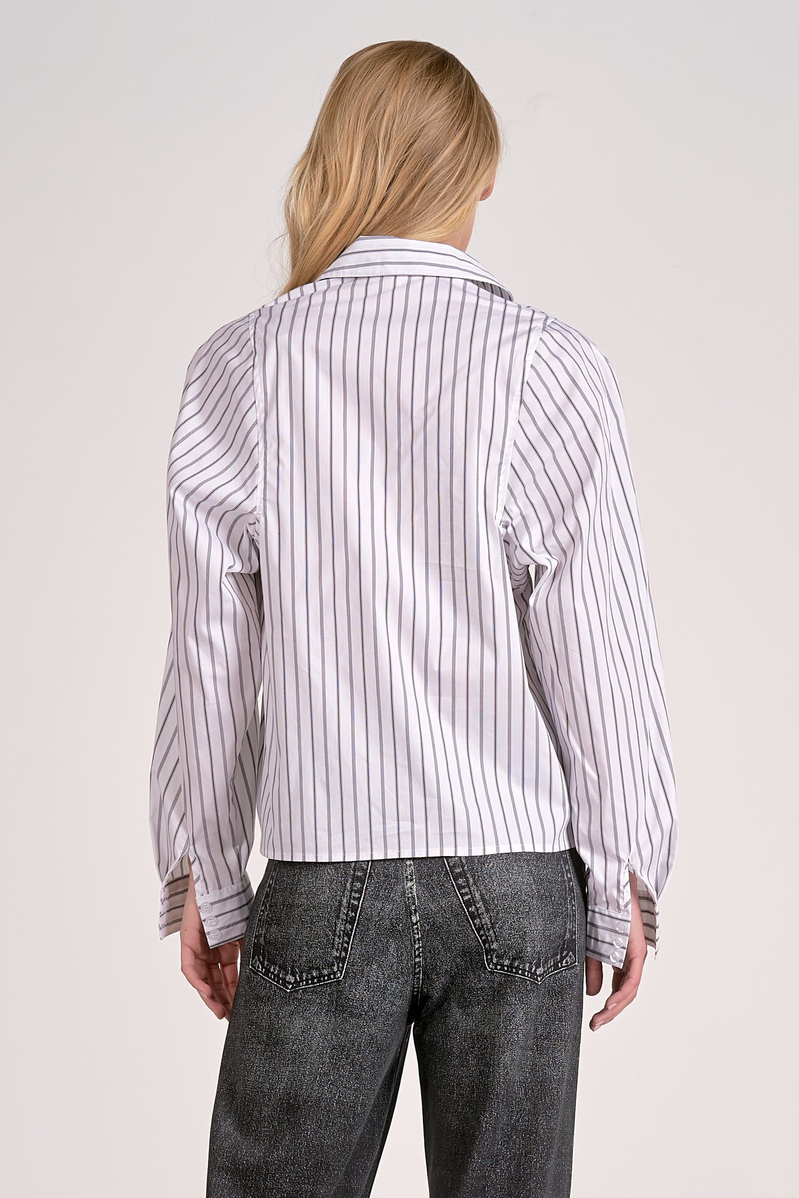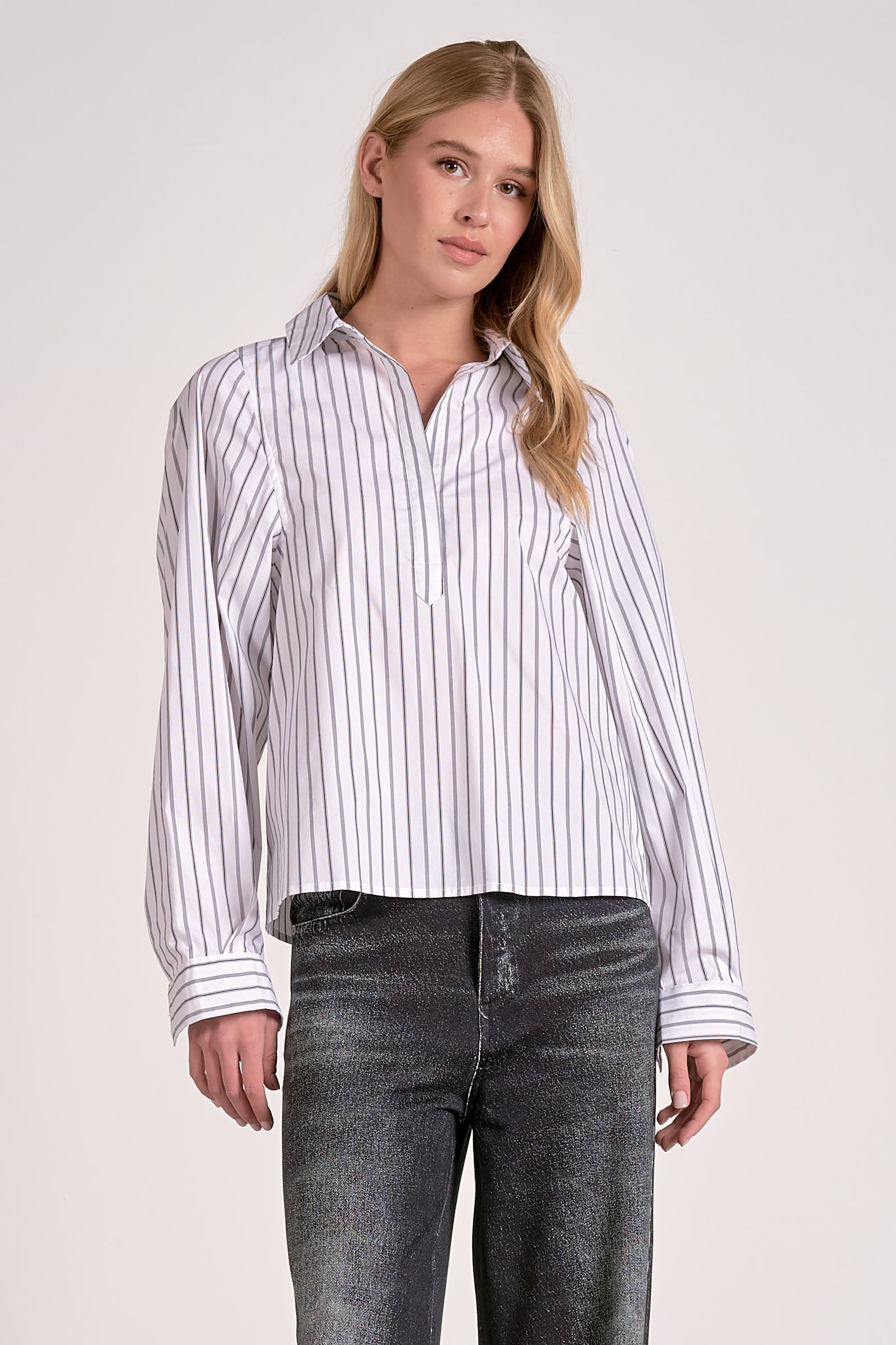 Pieced white blouse with black pinstripes going in the right directions! Slight puff sleeves take this blouse to the next level of fashion.