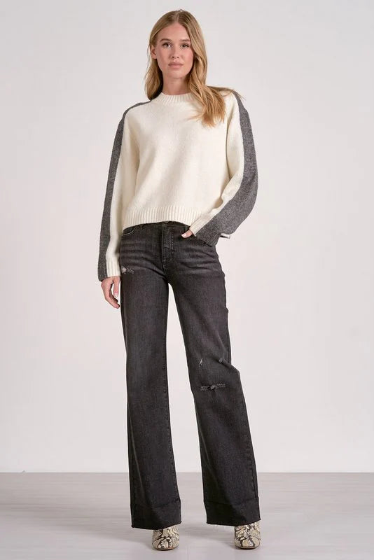 Striking cropped sweater is white in front and charcoal grey in back. Crew neck, wide sleeves.